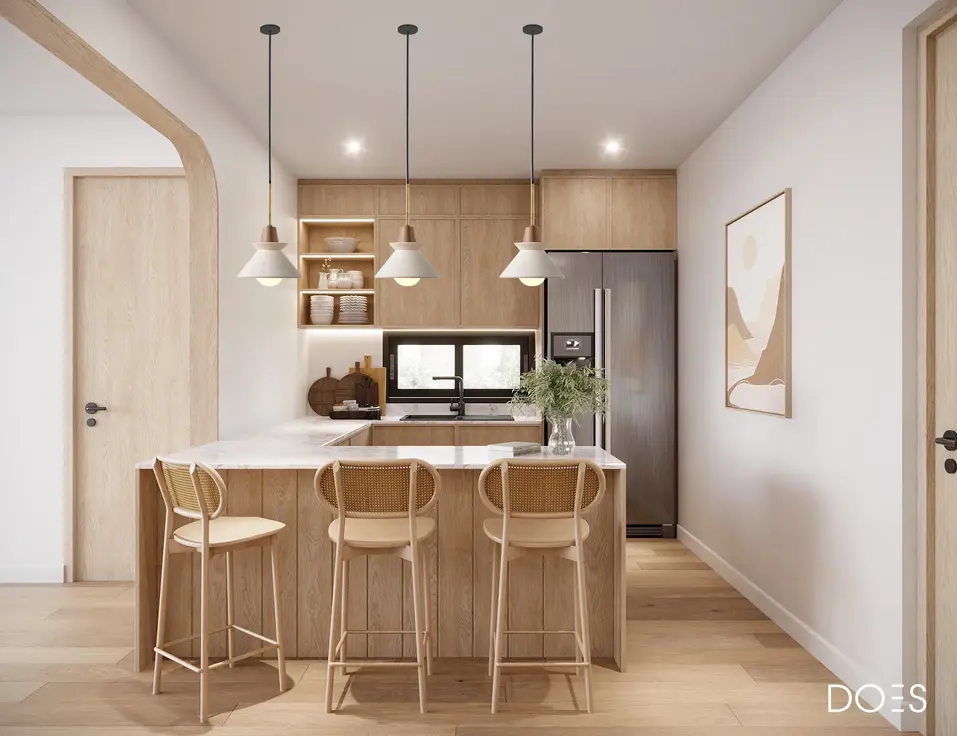 โดยเน้นการใช้โทนสีสว่าง เช่น สีขาว ครีม และสีไม้ธรรมชาติ เพื่อสร้างบรรยากาศที่โปร่งโล่งและผ่อนคลาย
