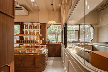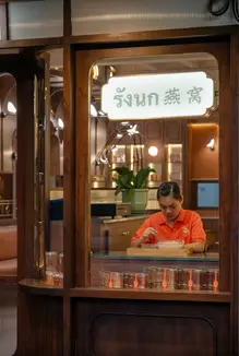 พรีเมี่ยม หน้าร้านทางด้านซ้ายเป็นครัวโชว์ ที่ต้องการให้มองเห็นกรรมวิธีประกอบอาหาร และทางด้านซ้ายจะถูกนำเสนอ ให้เป็นวางผลิตภัณฑ์รังนกผ่านดีไซน์กระจกโค้ง และยังเป็นบริเวณ ที่โชว์กรรมวิธีถอนขนรังนกอีกด้วย