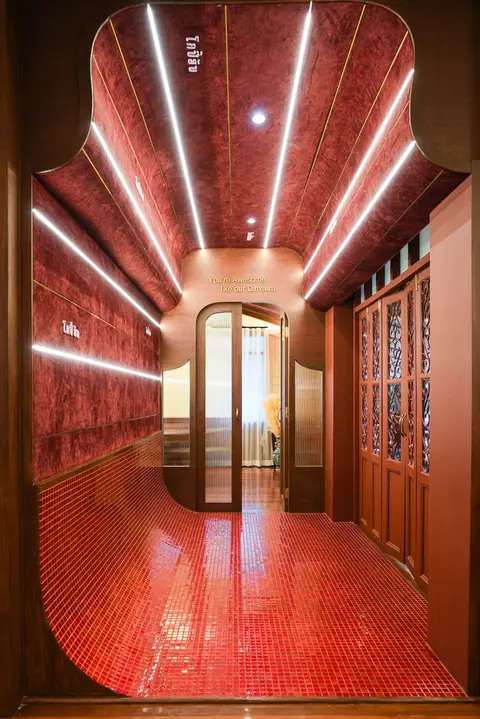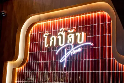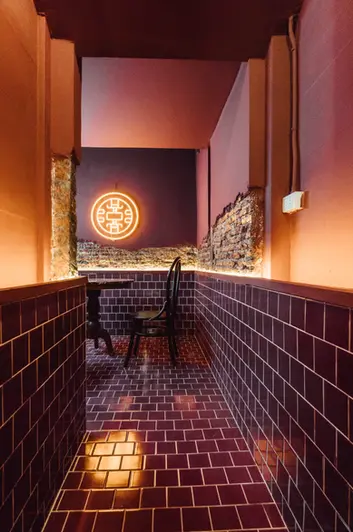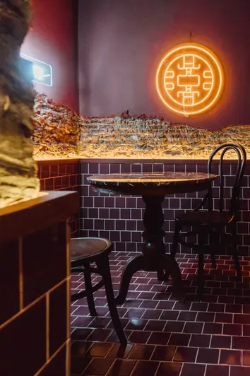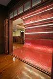 ทางด้านซ้ายของเคาน์เตอร์ จะเป็นบาร์ค็อกเทลที่นำลูกน้ำเต้ามาเป็นงานตกแต่ง ด้านขวาจะเป็นพื้นที่นั่งรับประทานที่เชื่อมกับห้องกระจกที่ต่อเติมใหม่ พื้นที่นี้ค่อนข้างมืดการแก้ปัญหา คือ การเพิ่มหลังคาใส เพื่อเพิ่มแสงธรรมชาติเข้ามาในอาคาร ไฮไลท์ชั้นนี้ น่าจะเป็นการนำห้องน้ำใต้ดินมาทำเป็นห้องลับสำหรับทานอาหาร