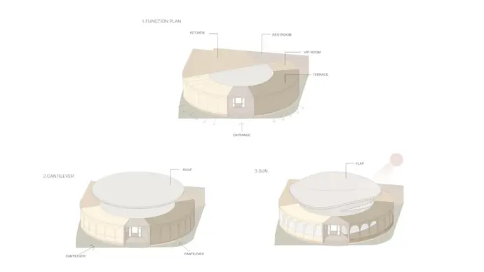 หลังคาภายนอก ที่มีลักษณะการพริ้วไหวเกิดจากการทดลองนำพัดกระดาษมาต่อกันให้ครบรัศมีของวงกลม และใช้ลมเป่าตามทิศทางของลมจริง ทำให้เกิดรูปทรงของหลังคาที่กระพือ ตาม Effect ที่เกิดขึ้น