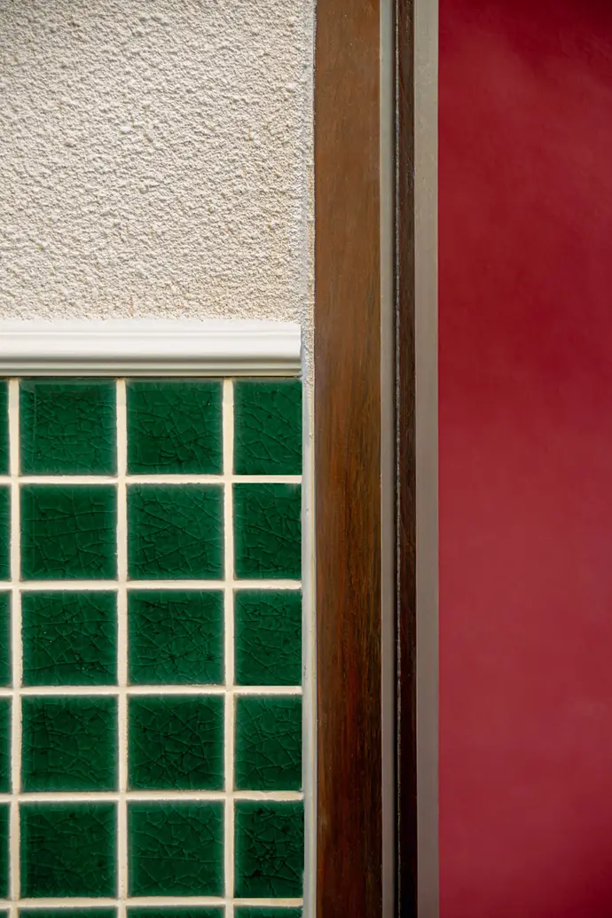 ภายในวัสดุหลักที่ใช้ในการตกแต่ง จะประกอบไปด้วย ไม้เก่า ,ผนังสีTexture,หินขัด และกระเบื้องSubway สีแดง ที่ผสมผสานความเก่าและใหม่ จนทำให้เกิดความร่วมสมัย อีกส่วนสำคัญ คือ การนำเข่งติ่มซำซึ่งเป็นวัสดุที่เราคุ้นตาอยู่แล้ว มาตกแต่ง ทำให้ลูกค้าที่มาใช้บริการจนเกิดภาพจำกับร้านอาหารแห่งนี้