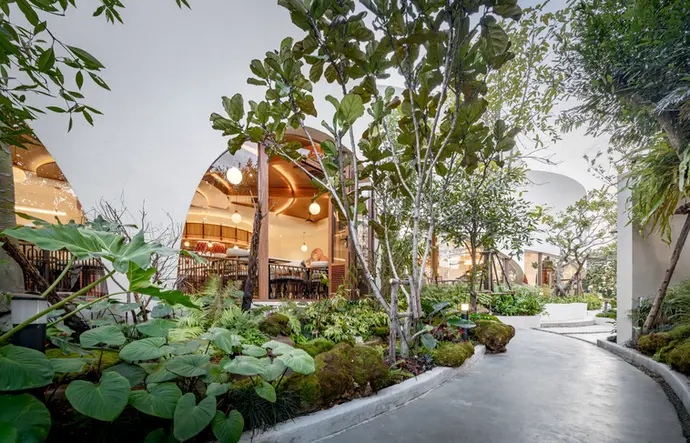 การออกแบบสวนภายนอก จะถูกแบ่งออกเป็น 2 รูปแบบ คือ Modern garden และ Tropical garden ซึ่งการวางตำแหน่งของสวน Modern จะถูกจัดวางไว้บริเวณหน้าอาคาร ที่โดนแดดจัดในช่วงบ่ายถึงเย็น ทำให้ต้องใช้ไม้ที่ทนแดดและดูแลง่ายที่สุด การเดินระหว่างหน้าอาคารไปหลังอาคารเป็นการ Transition ความรู้สึกของผู้มาใช้จากร้อนไปในส่วนที่เย็นที่สุด คือ สวน Tropical นั่นเอง ซึ่งจะประกอบไปด้วย บ่อน้ำ และน้ำตก พรรณไม้ในตระกลูเฟิร์นและมอส สอดรับกับพื้นที่โซนระเบียงและห้อง VIP ของร้าน นับเป็นสุนทรียภาพในการรับประทานอาหารอีกรูปแบบนึง